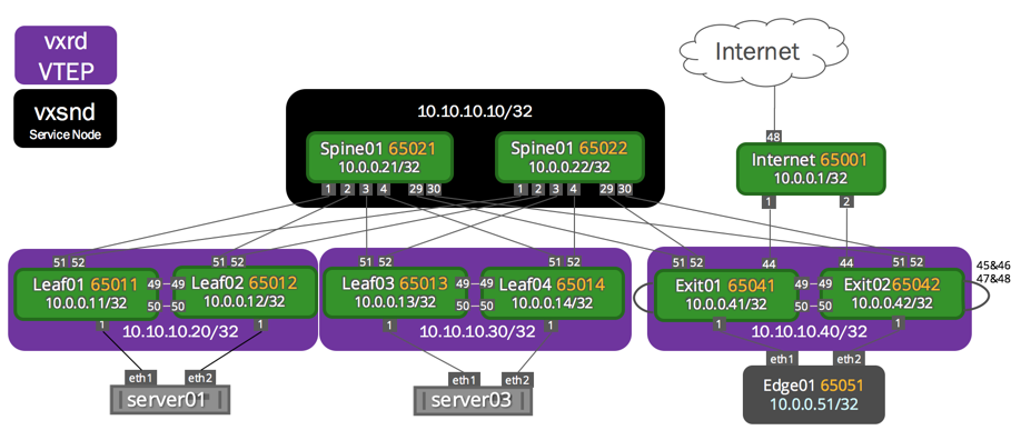 | exit leaf | A switch dedicated to peering the Clos network to an outside network; also referred to as a border leaf, service leaf, or edge leaf. |