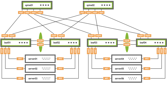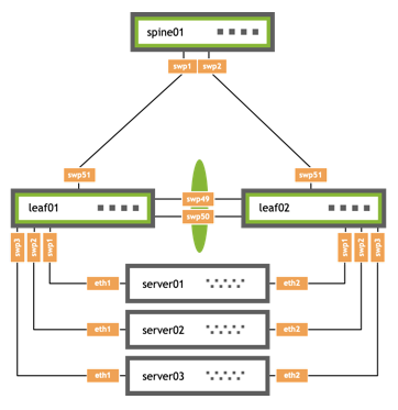 sudo ifreload -acommand to apply all the configuration changes:cumulus@leaf01:~$ sudo ifreload -acumulus@leaf02:~$ sudo nano /etc/network/interfaces ... auto bridge iface bridge bridge-ports bond1 bond2 peerlink bridge-vlan-aware yes ... auto peerlink iface peerlink bond-slaves swp49 swp50auto peerlink.4094 iface peerlink.4094 clagd-backup-ip 10.10.10.1 clagd-peer-ip linklocal clagd-sys-mac 44:38:39:BE:EF:AA …