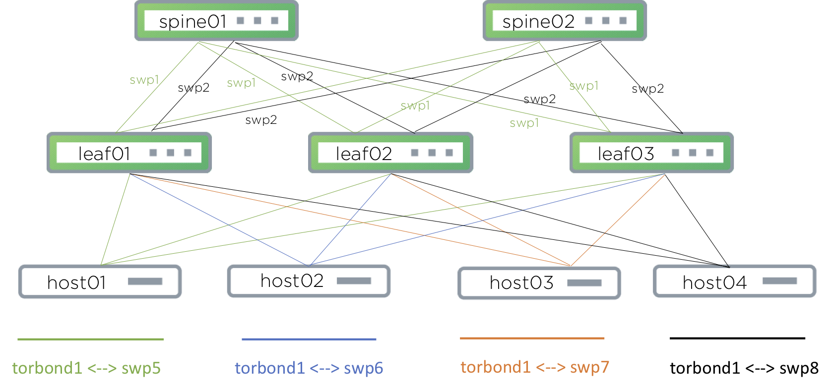 As previously described, every packet in a flow hashes to the same next hop. However, if that next hop is no longer valid, the traffic flows to another anycast next hop instead. For example, in the image below, if leaf03 fails, traffic flows to a different anycast address; in this case, server04: