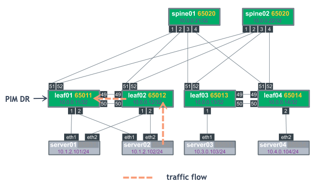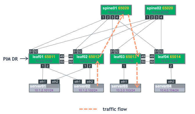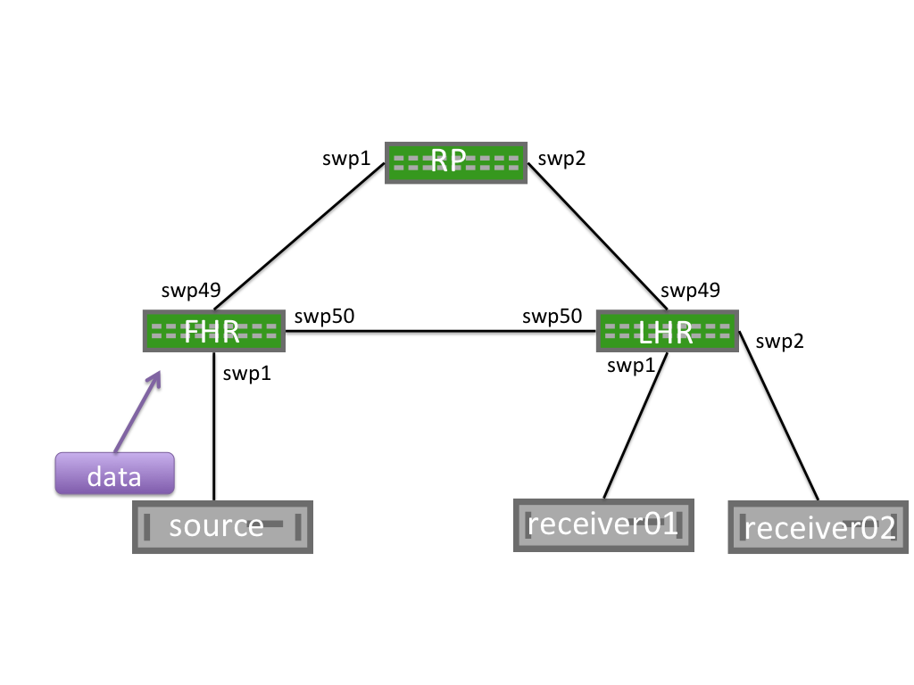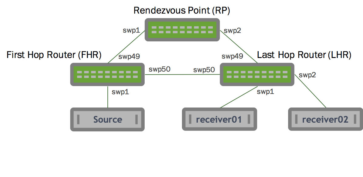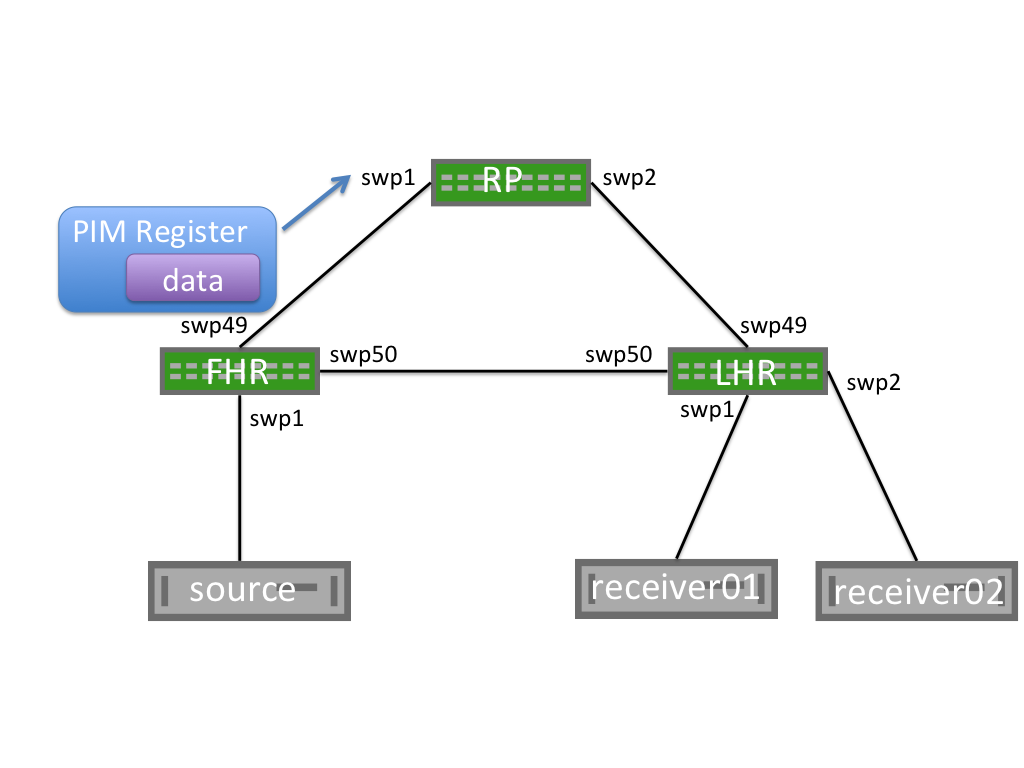 tcpdumpto see if the PIM register packets are arriving:cumulus@rp01:~$ sudo tcpdump -i swp30 tcpdump: verbose output suppressed, use -v or -vv for full protocol decode listening on swp30, link-type EN10MB (Ethernet), capture size 262144 bytes 23:33:17.524982 IP 172.16.5.1 > 10.0.0.21: PIMv2, Register, length 66 -