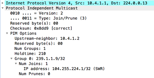 This PIM join/prune is for group 239.1.1.9, with 1 join and 0 prunes for the group. Join/prunes for multiple groups can exist in a single packet. The following shows an S,G Prune example: 21:49:59.470885 IP (tos 0x0, ttl 255, id 138, offset 0, flags [none], proto PIM (103), length 54) |