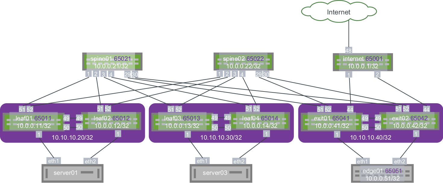 | exit leaf | A switch dedicated to peering the Clos network to an outside network; also referred to as a border leaf, service leaf, or edge leaf. |