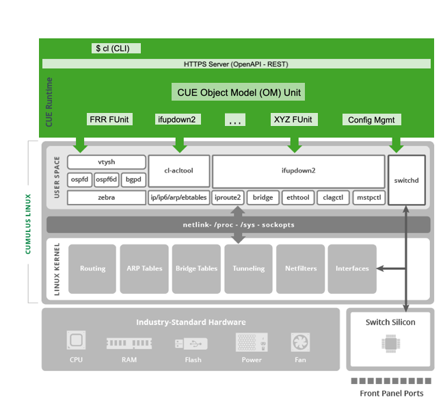 CUE is an object-oriented, schema driven model of a complete Cumulus Linux system (hardware and software) providing a robust API that allows for multiple interfaces to both view (show) and configure (set and unset) any element within a system running the CUE software. The CUE CLI and the REST API leverage the same API to interface with Cumulus Linux.