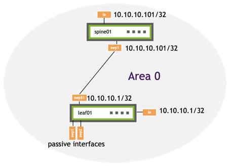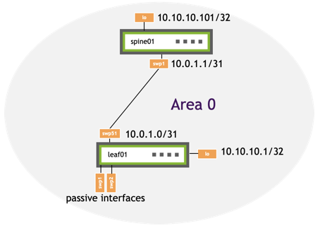 • All interfaces on the switch with an IP address that matches subnet 10.10.10.101/32 and swp1 with IP address 10.0.1.1/31 are in area 0.