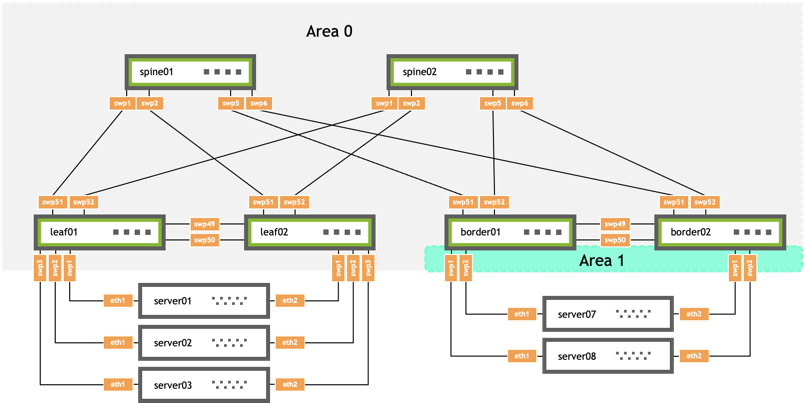 • All the interfaces on the switch with an IP address that matches subnet 10.10.10.1/32 and swp51 with IP address 10.0.1.0/31 are in area 0