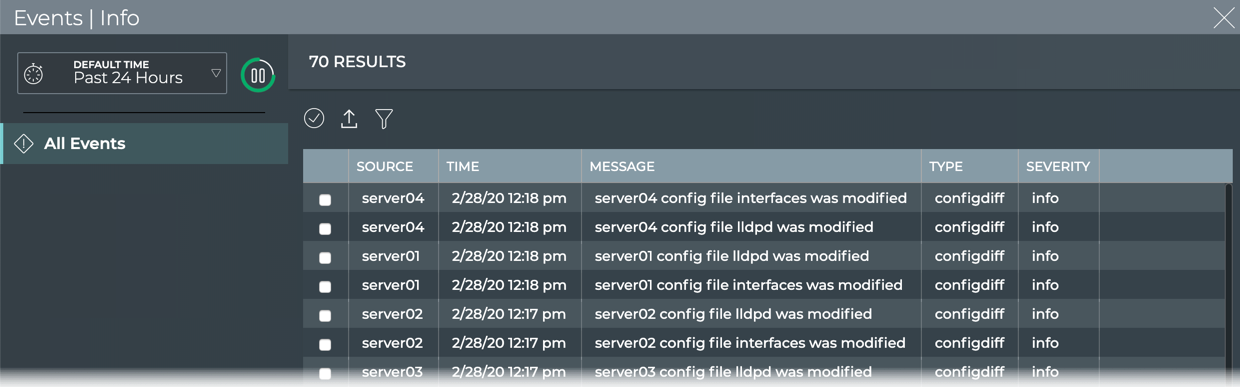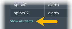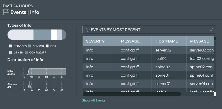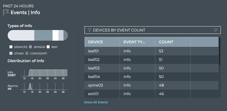 You can view all events in the network either by clicking the Show All Events link under the table on the large Info Events card, or by opening the full screen Info Events card.