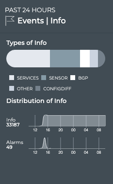 While you can see the relative relationship between info and alarm events on the small Info card, the medium and large cards provide considerably more information. Open either of these to view individual line charts for the events. Generally, alarms have some corollary info events. For example, when a network service becomes unavailable, a critical alarm is often issued, and when the service becomes available again, an info event of severity warning is generated. For this reason, you might see some level of tracking between the info and alarm counts and distributions. Some other possible scenarios: