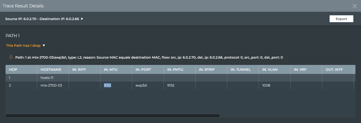 If the trace was run on a Mellanox switch and drops were detected by the What Just Happened feature, they are identified above the path. Click the down arrow to view the list of drops and their details. Click the up arrow to close the list.
