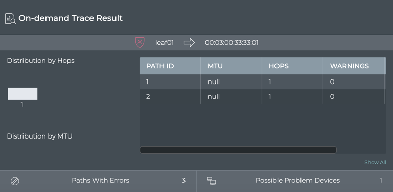 In our example, we can verify that every path option had five hops since the distribution chart only shows one hop count and the table indicates each path had a value of five hops. Similarly, you can view the MTU data. If there had been any warnings, the count would have been visible in the table.