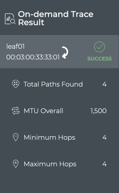 In this example, we see that the trace was successful. Four paths were found between the devices, each with four hops and with an overall MTU of 1500. If there was a difference between the minimum and maximum number of hops or other failures, viewing the results on the large card would provide additional information.