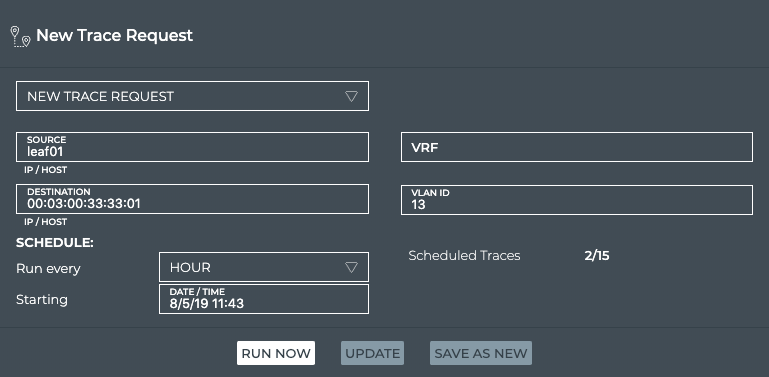 | VRF | Optional for layer 3 traces. Virtual Route Forwarding interface to be used as part of the trace path. |