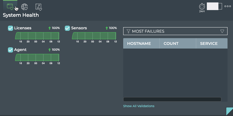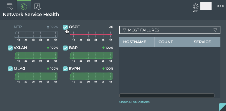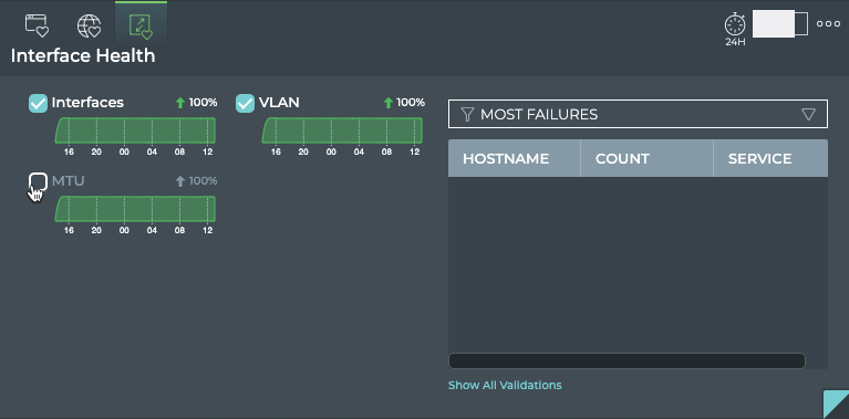| Show All Validations | Opens full screen Network Health card with a listing of validations performed by network service and protocol |