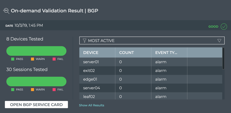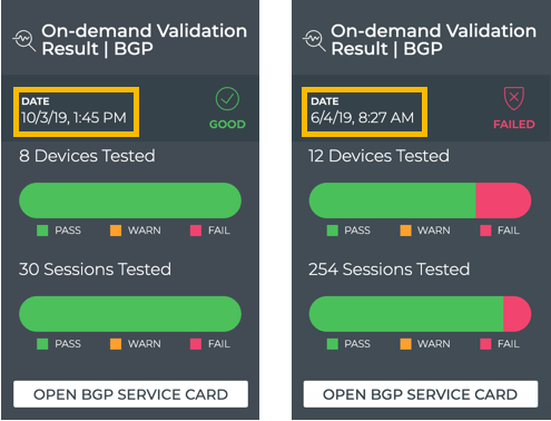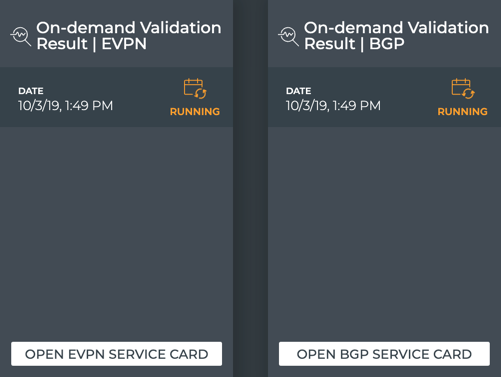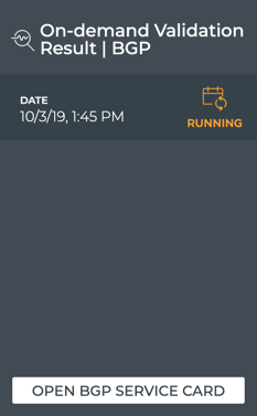 The On-demand Validation Result card workflow enables you to view the results of on-demand validation requests. When a request has started processing, the associated medium Validation Result card is displayed on your workbench. When multiple network protocols or services are included in a validation, a validation result card is opened for each protocol and service.
