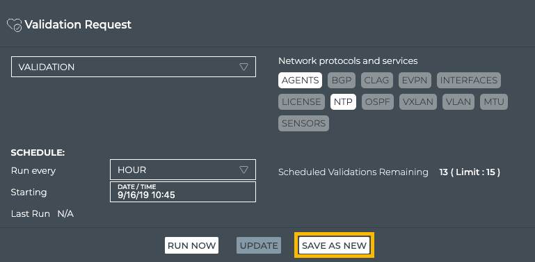 Be aware, that if you update a previously saved validation request, the historical data collected will no longer match the data results of future runs of the request. If your intention is to leave this request unchanged and create a new request, click Save As New instead. |