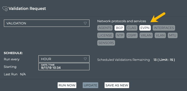 Click the names of the protocols and services you want to validate. We selected BGP and EVPN in this example.