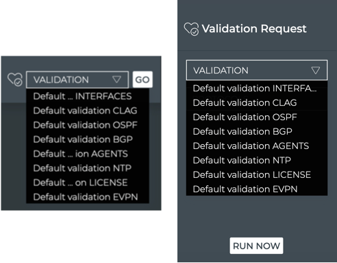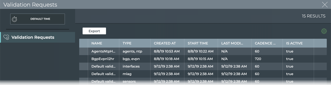| Validation | Select a scheduled request to run that request on-demand. A default validation is provided for each supported network protocol and service, which runs a network-wide validation check. These validations run every 60 minutes, but you may run them on-demand at any time. Note: No new requests can be configured from this size card. |