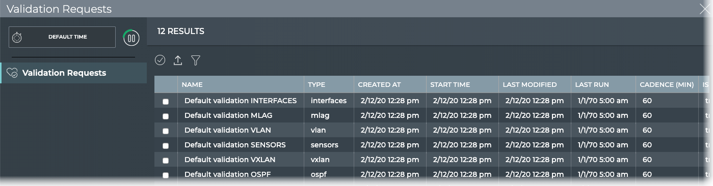 | On-demand Validation Result | <network protocol or service> | Displays all unscheduled validation results. By default, the results list is sorted by Timestamp. This tab provides the following additional data about each result: