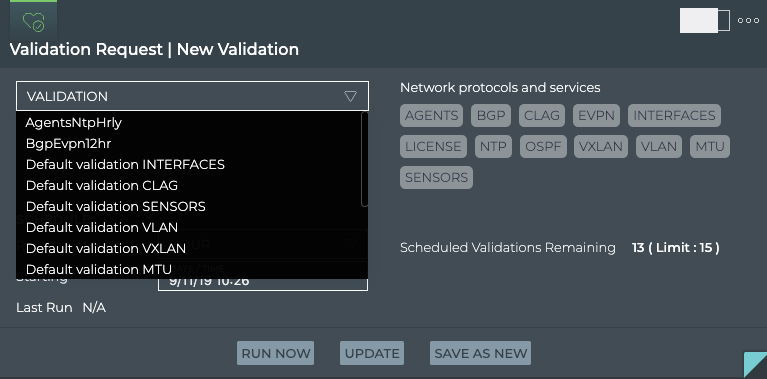 This release supports validation of the following network protocols and services: Agents, BGP, CLAG, EVPN, Interfaces, License, MTU, NTP, OSPF, Sensors, VLAN, and VXLAN.