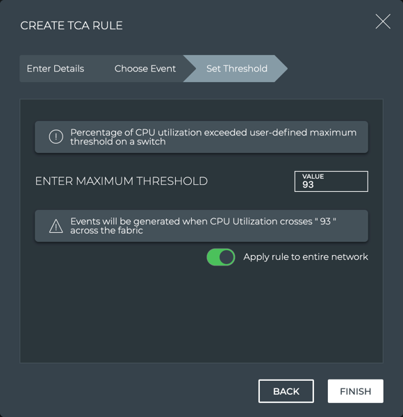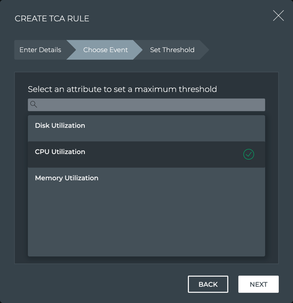 On the Enter Details step, enter a name for your rule, choose your TCA event type, and assign a severity.