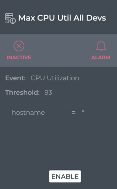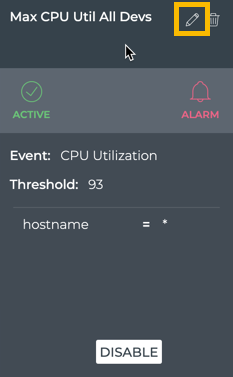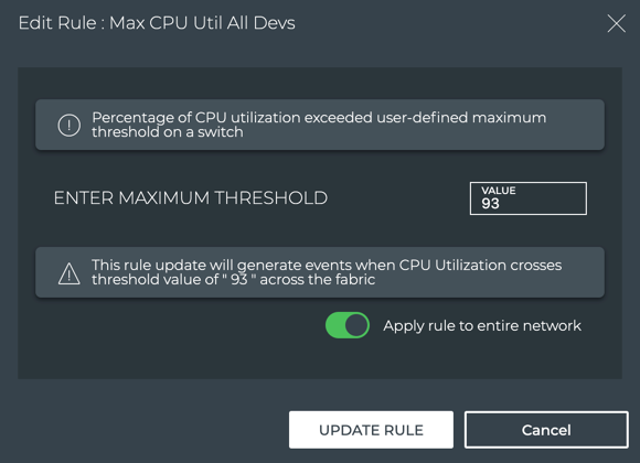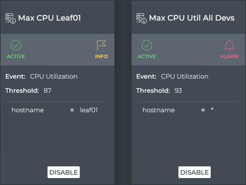 This example shows two rules. The rule on the left triggers an informational event when switch leaf01 exceeds the maximum CPU utilization of 87%. The rule on the right triggers a critical event when any device exceeds the maximum CPU utilization of 93%. Note that the cards indicate both rules are currently Active.