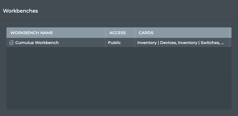 You can view all of your workbenches in a list form, making it possible to manage various aspects of them. There are public and private workbenches. Public workbenches are visible by all users. Private workbenches are visible only by the user who created the workbench. From the Workbenches card, you can: