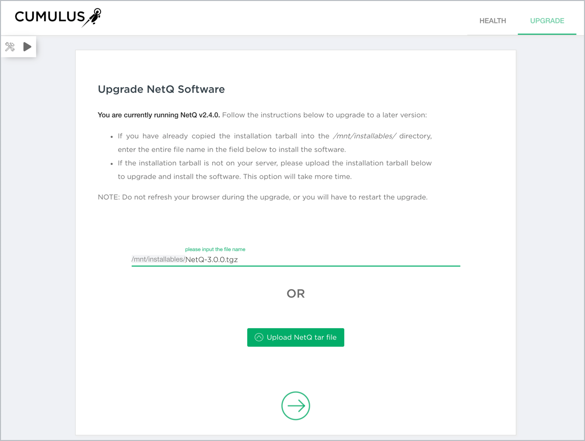 Enter NetQ-3.0.0.tgz or NetQ-3.0.0-opta.tgz and click
