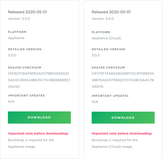 cumulus@<hostname>:~$ cat /etc/app-release BOOTSTRAP_VERSION=3.0.0 APPLIANCE_MANIFEST_HASH=d40ca38672 APPLIANCE_VERSION=3.0.0