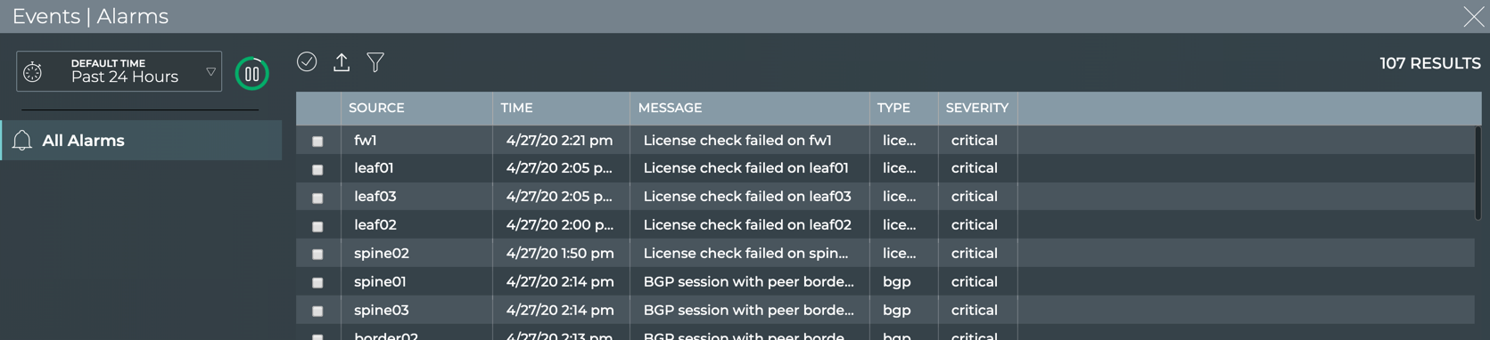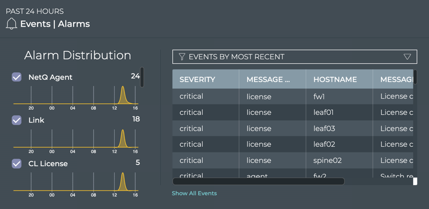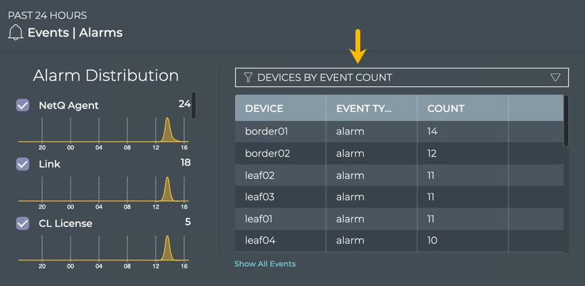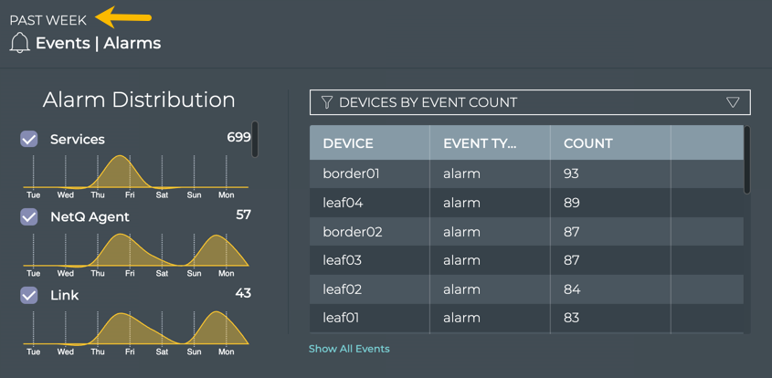 You can view all events in the network either by clicking the Show All Events link under the table on the large Alarm Events card, or by opening the full screen Alarm Events card.