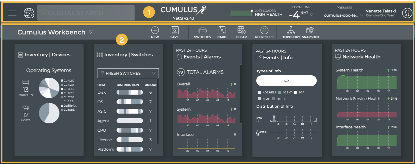 - Application Header (1): Contains the main menu, recent actions history, search capabilities, NetQ version, quick health status chart, local time zone, premises list (cloud-only), and user account information.