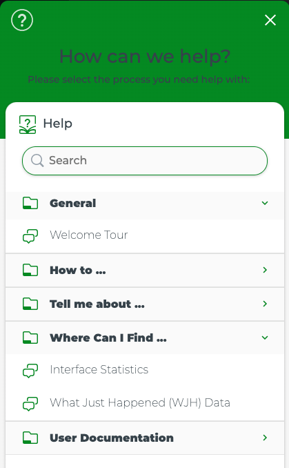 You can search for help items by collapsing and expanding categories or by searching. Click a category title to toggle between viewing and hiding the content. To search, begin entering text into the Search field to see suggested content.