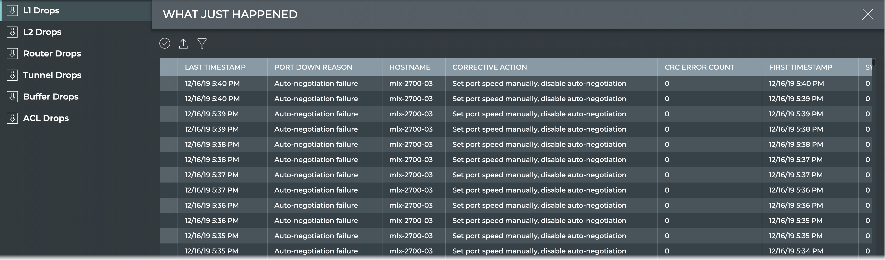 The What Just Happened view displays events based on conditions detected in the data plane. The most recent 1000 events from the last 24 hours are presented for each drop category.
