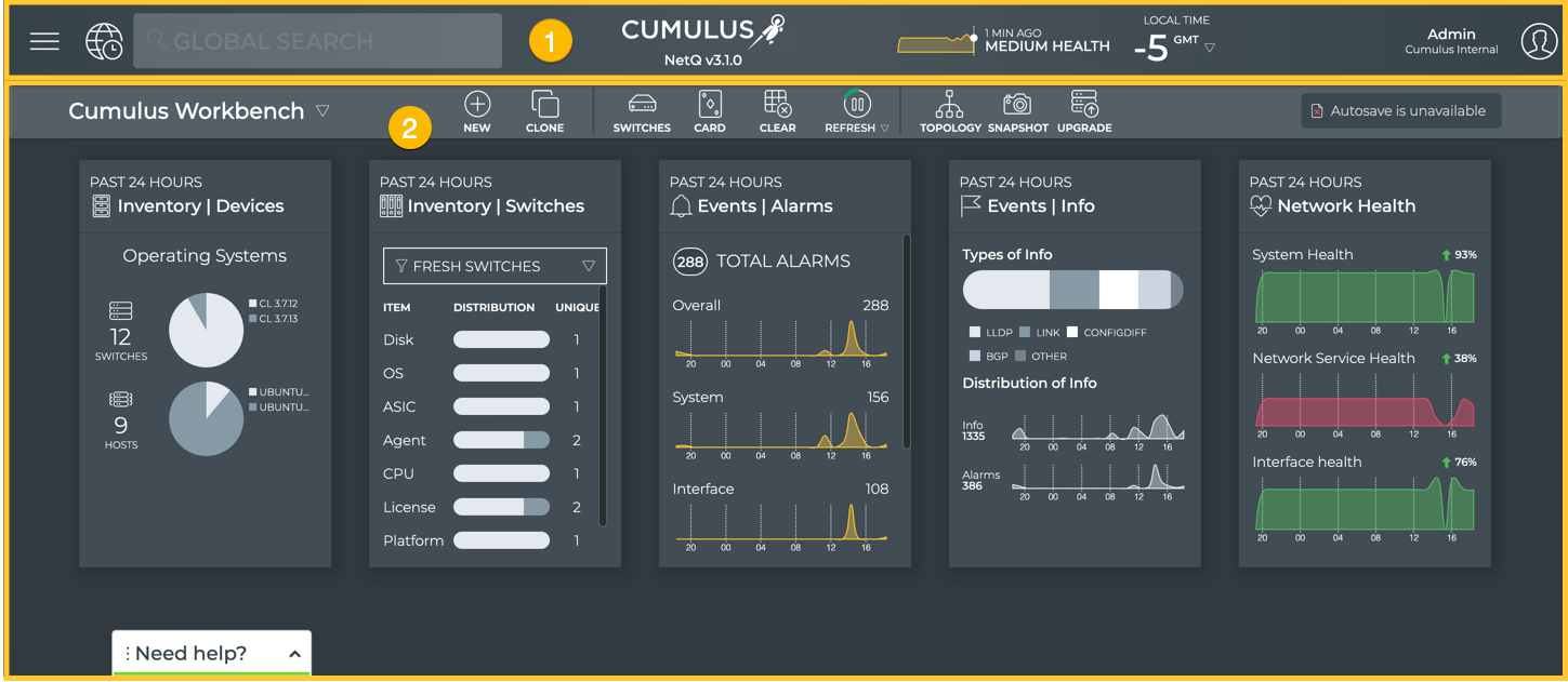 - Application Header (1): Contains the main menu, recent actions history, search capabilities, NetQ version, quick health status chart, local time zone, premises list, and user account information.