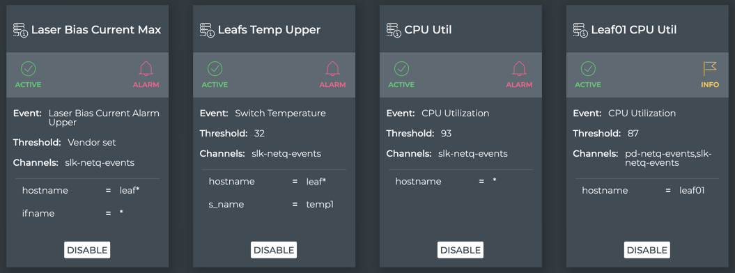 The simplest configuration you can create is one that sends all events generated by all interfaces to a single notification application. This is described here. For more granular configurations and examples, refer to Configure Advanced NetQ Event Notifications.