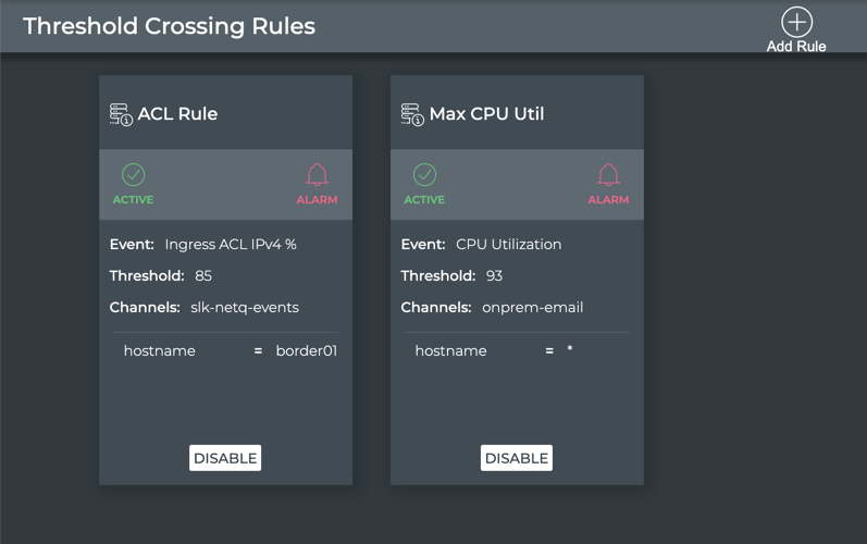 - Threshold Crossing Rules card: specify rules and filters, assign existing channels