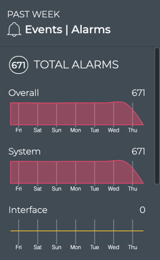 The Events|Alarms card shows critical severity events. You can view the devices that have the most alarms or you can view all alarms on a device.