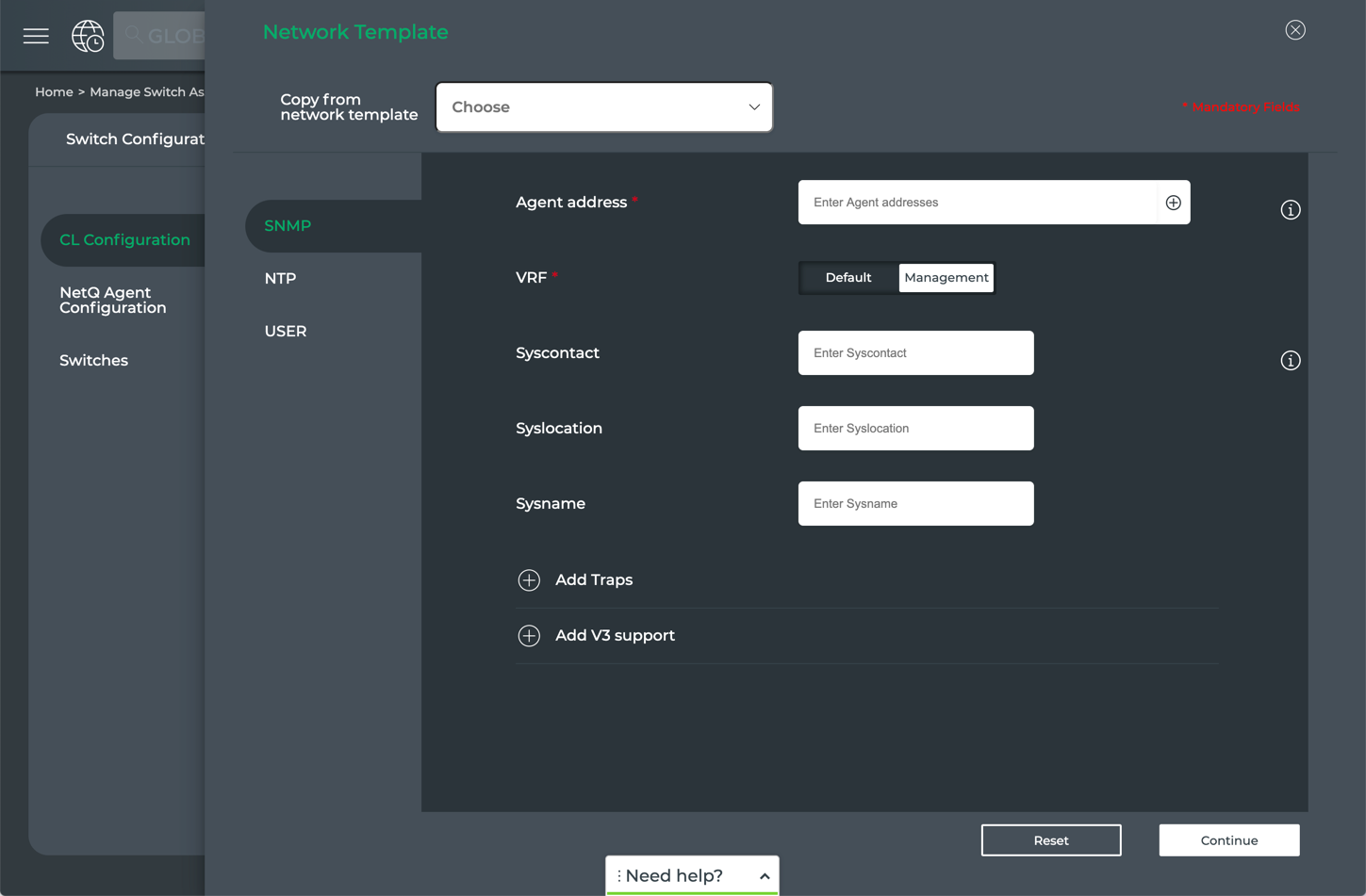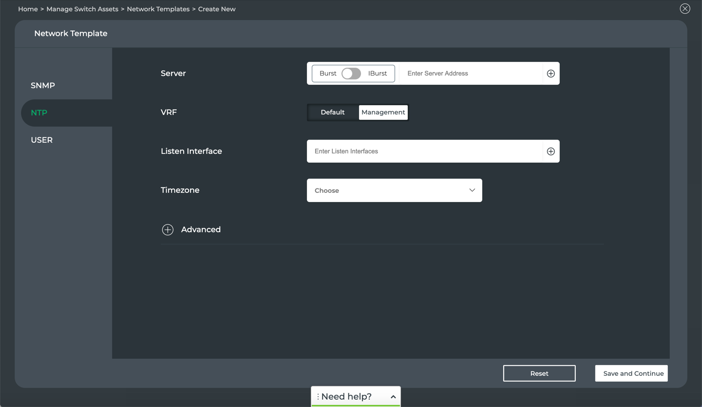If you have selected a network template that has any SNMP parameters specified, you must specify the additional required parameters, then click Continue or click NTP.