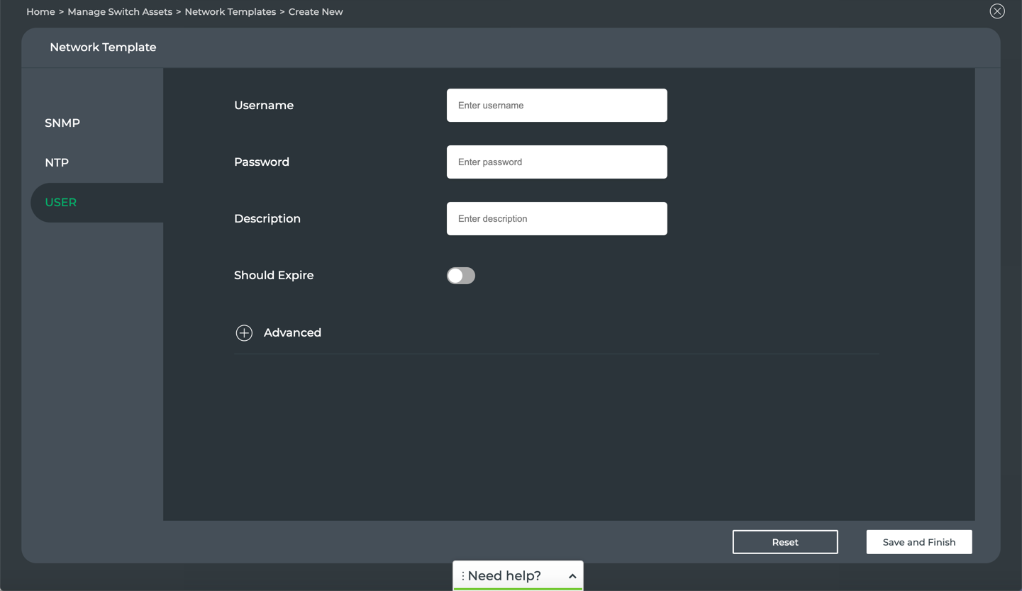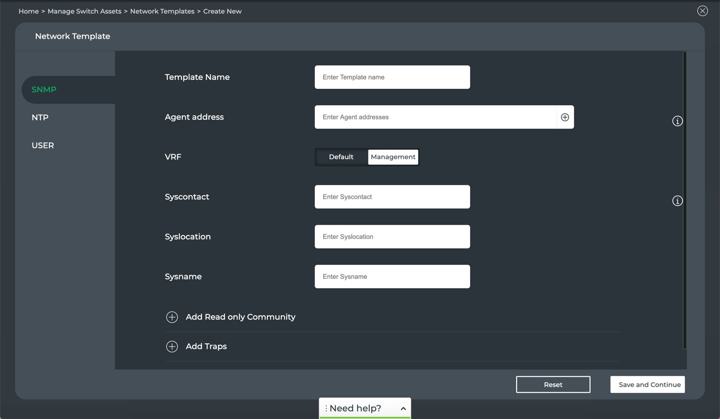 Select the SNMP, NTP, or User forms to specify parameters for this configuration. Note that selected parameters are required on each form, noted by red asterisks (*). Refer to Create Network Templates for a description of the fields.