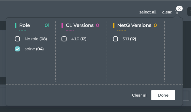 Scroll down or use the select all, clear, filter , and Search options to help find the switches of interest. You can filter by role, Cumulus Linux version, or NetQ version. The badge on the filter icon indicates the number of filters applied. Colors on filter options are only used to distinguish between options. No other indication is intended.