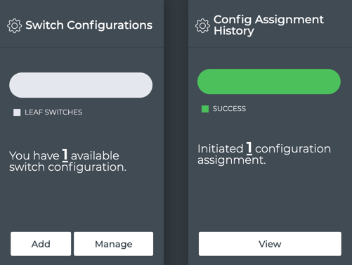 When you return the dashboard, your Switch Configurations card shows the new configurations and the Config Assignment History card appears that shows a summary status of all configuration assignment jobs attempted.