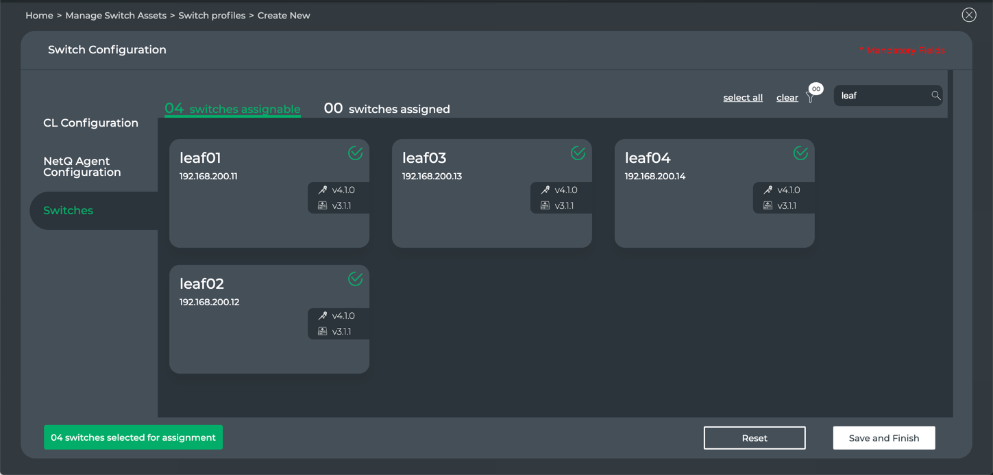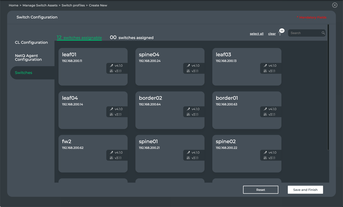 - Above the switches (right), management tools to help find the switches you want to assign with this configuration, including select all, clear, filter, and search.