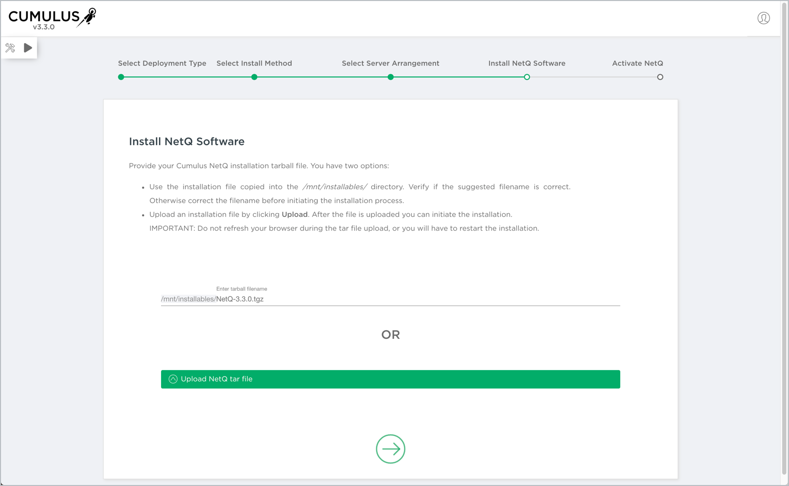 NetQ-3.3.0-tgzfor on-premises deployments orNetQ-3.3.0-opta.tgzfor cloud deployments) that you downloaded and stored previously.For on-premises: Accept the path and filename suggested, or modify these to reflect where you stored your installation file, then click