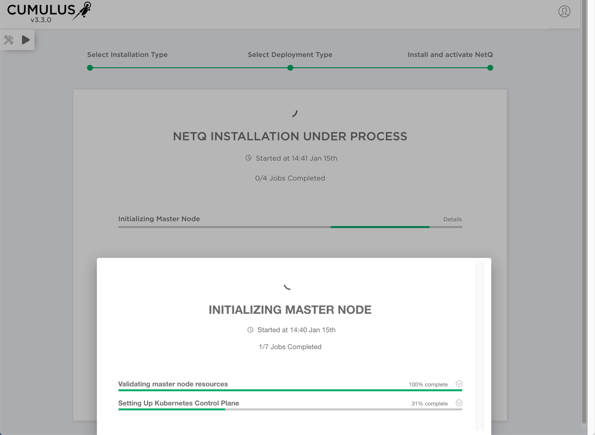 netq boostrap resetandnetq bootstrap mastercommands, then reopen the Admin UI to start installation again. - Yes: click