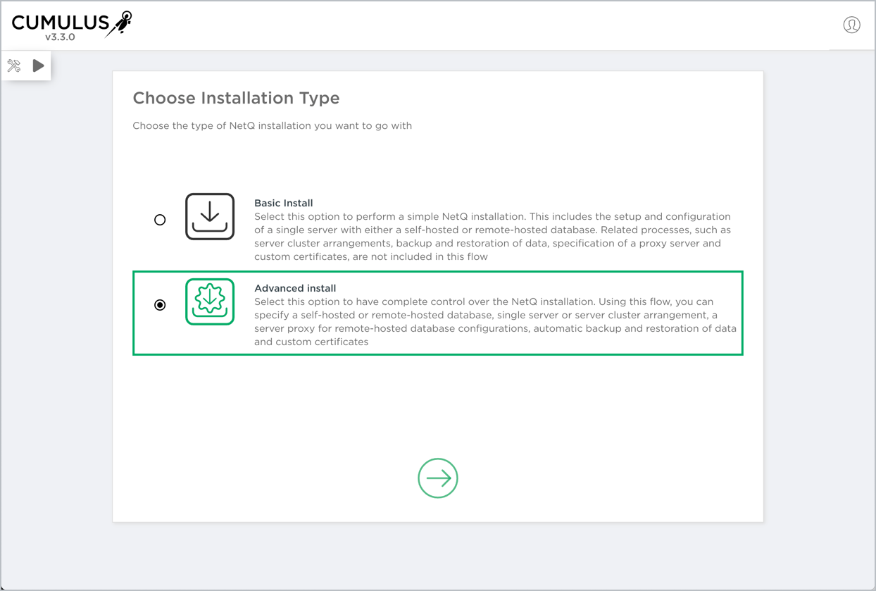 You can now install the NetQ software using the Admin UI using the default basic installation or an advanced installation.