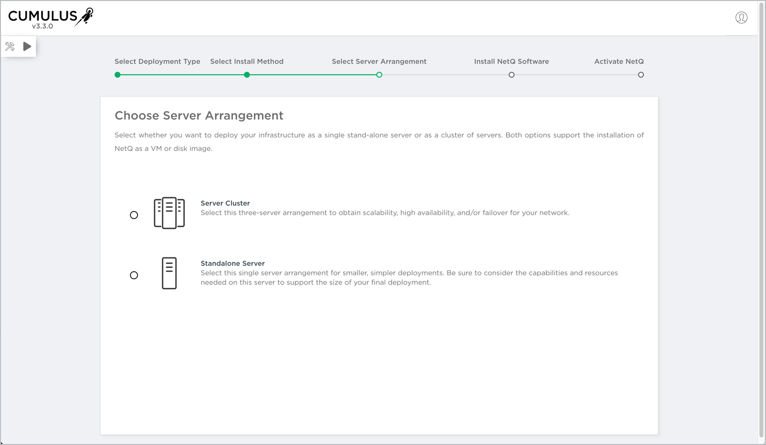 Select whether you want to deploy your infrastructure as a single stand-alone server or as a cluster of servers.