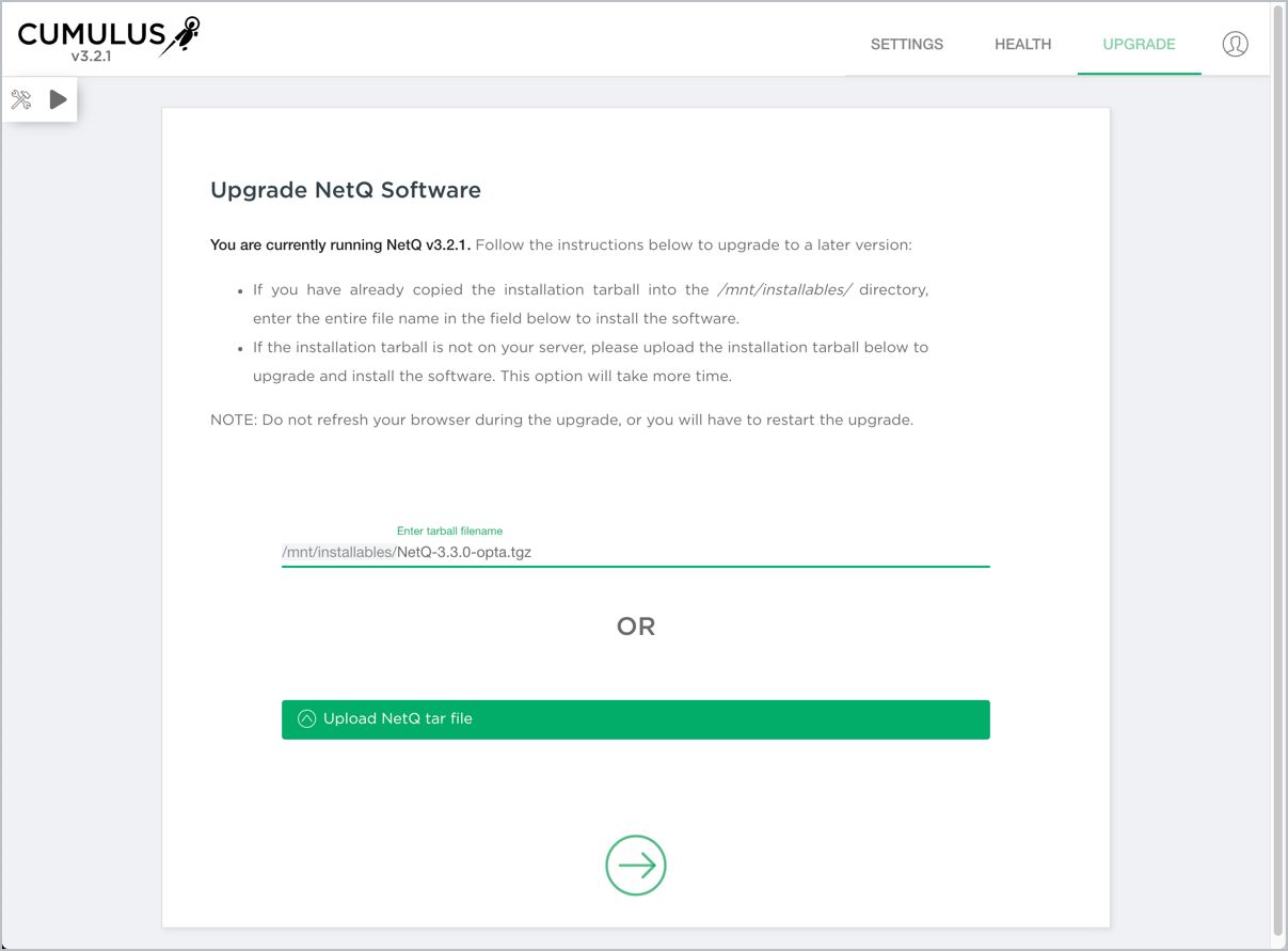 Enter NetQ-3.3.1.tgz or NetQ-3.3.1-opta.tgz and click