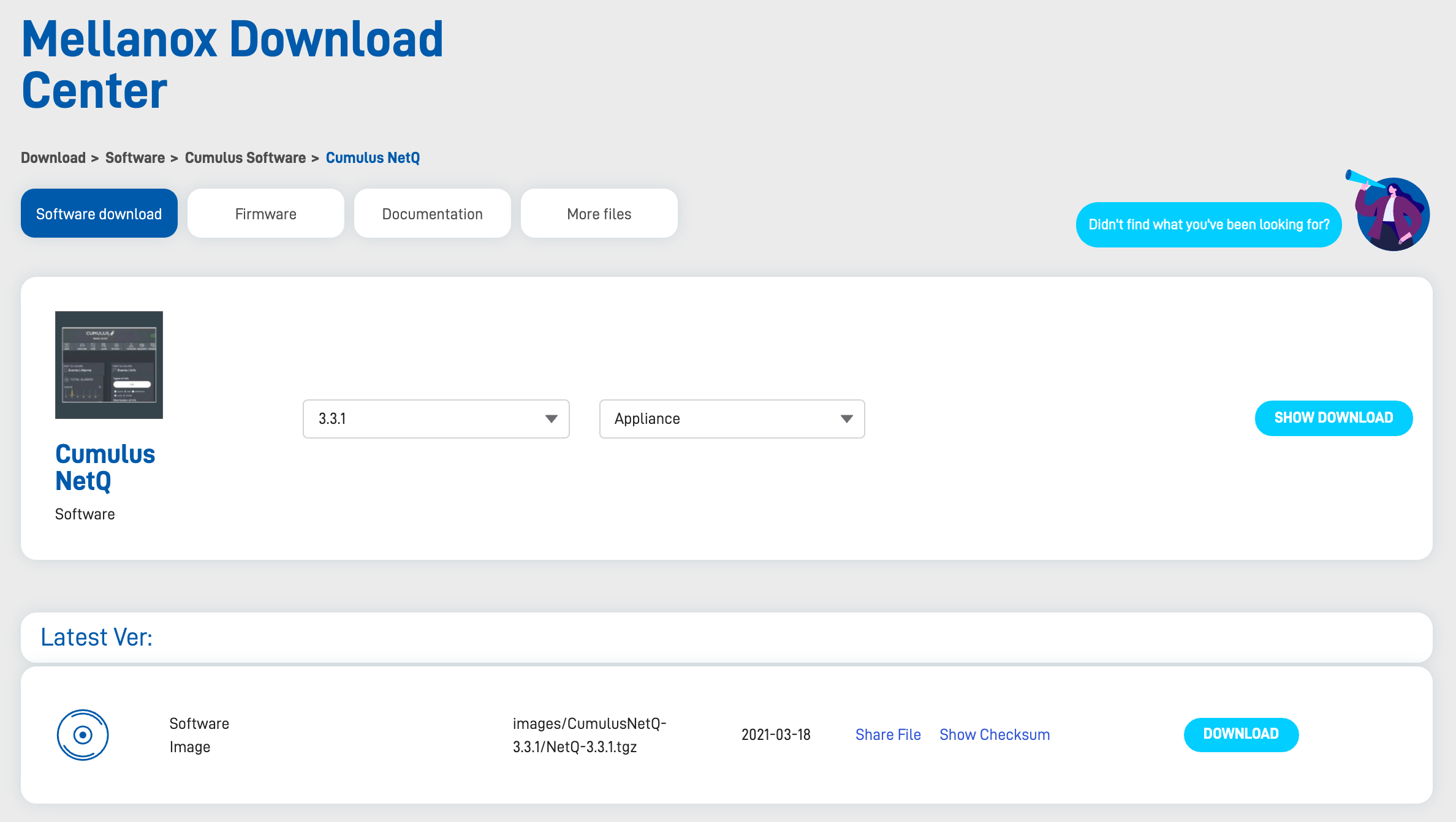 Existing customer who has downloaded NetQ software before September 1, 2020:- On the MyMellanox Downloads page, select NetQ from the Software -> Cumulus Software list.