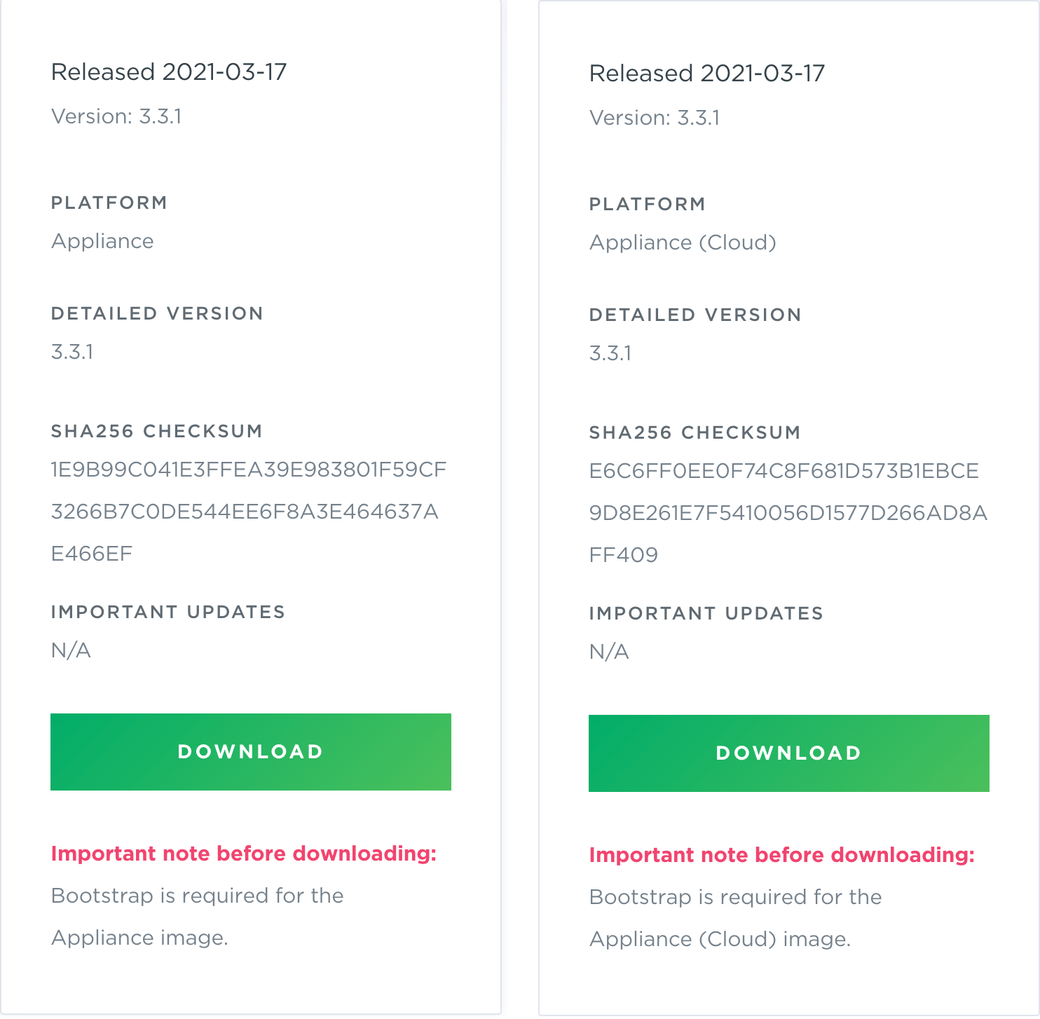 cumulus@<hostname>:~$ cat /etc/app-release BOOTSTRAP_VERSION=3.3.1 APPLIANCE_MANIFEST_HASH=74ac3017d5 APPLIANCE_VERSION=3.3.1