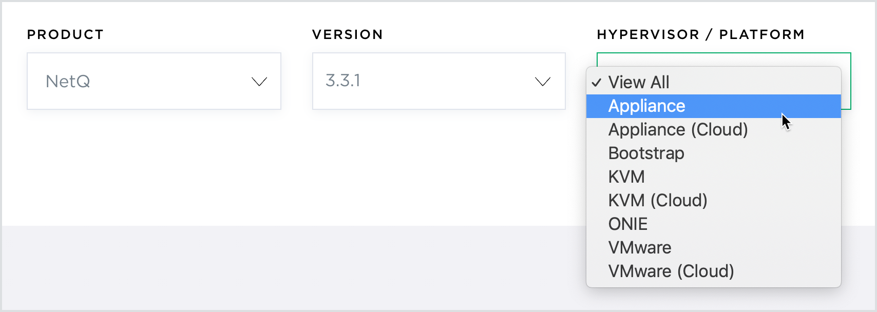 If you are upgrading NetQ Platform software for a NetQ On-premises Appliance or VM, select Appliance to download the NetQ-3.3.1.tgz file. If you are upgrading NetQ Collector software for a NetQ Cloud Appliance or VM, select Appliance (Cloud) to download the NetQ-3.3.1-opta.tgz file.