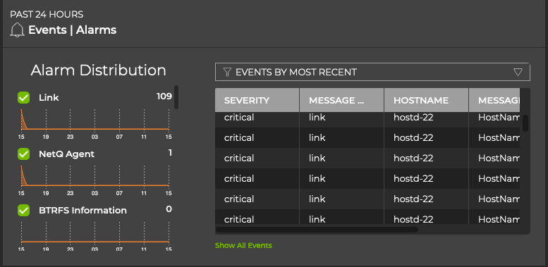 • Events|Alarms: information about all critical severity events in the system