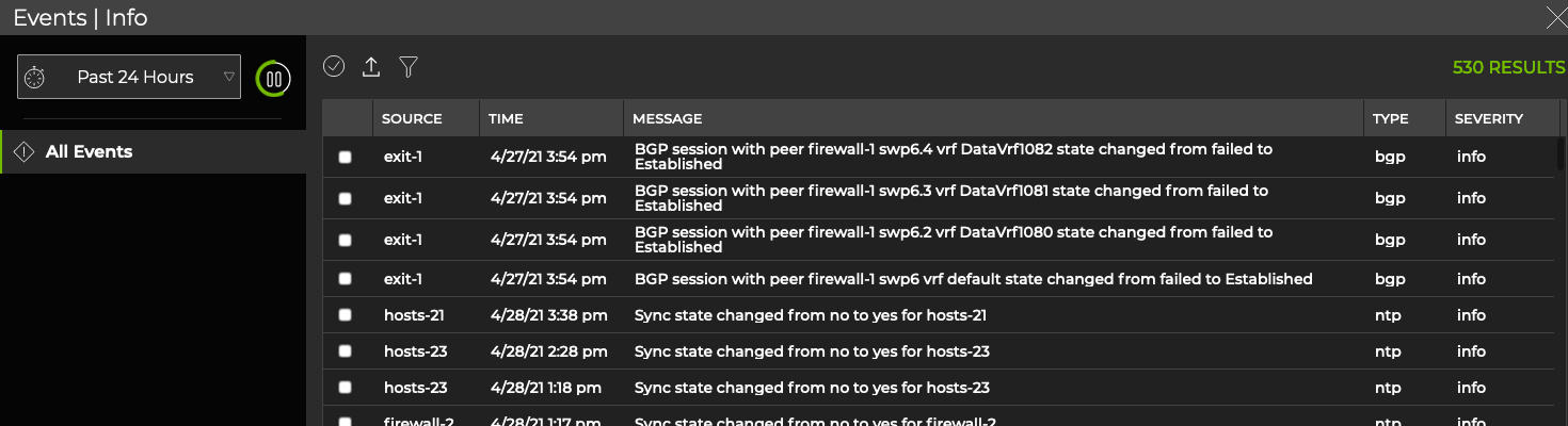 Full-screen cards are most effective for viewing all available data about an aspect of your network all in one place. When you cannot find what you need in the small, medium, or large cards, it is likely on the full-screen card. Most full-screen cards display data in a grid, or table; however, some contain visualizations. Some examples include All Events card and All Switches card, as shown here.